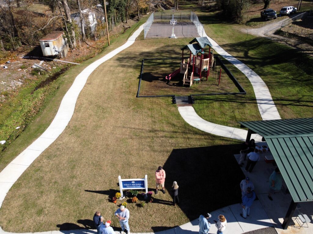 VERY TOP PHOTO: WLAF’s Charlie Hutson shares an aerial photo via Eagle I of the walking trail, basketball court, children’s play area and pavilion at William S. (Bill) Robinson Memorial Park.