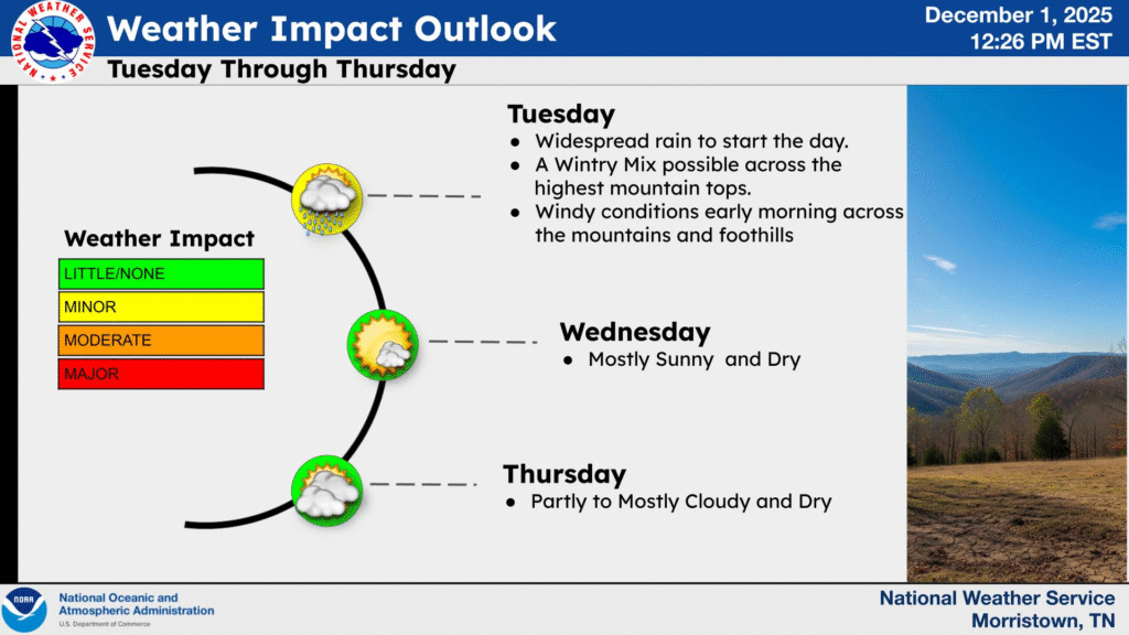 LAFOLLETTE, TN (WLAF)- Today, there’ll be sunshine with a high of 45 as dry conditions persist until the evening hours. It’ll be mostly sunny early, with increasing high and mid-level clouds through the day. Another system will bring gusty mountain winds and widespread rain to Campbell County and the area tonight through Tuesday. We cannot rule out seeing Tuesday begin with a wintry mix of rain, sleet and snow as temps hold steady in the 30s. Rain and wintry mix chances diminish once we clear lunch time on Tuesday.