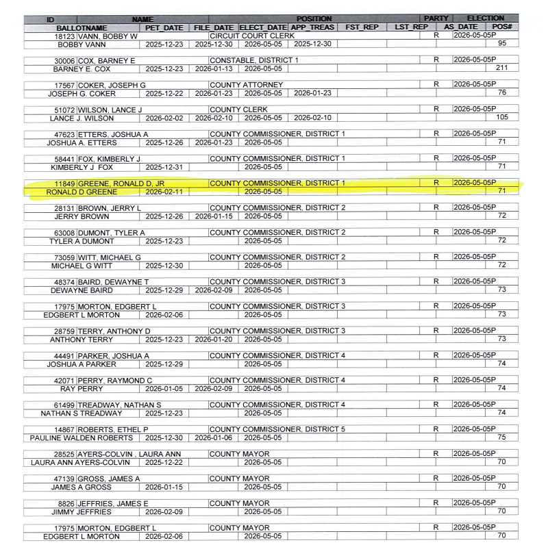 Activity on Wednesday at the Election Commission office includes Marvin Rutherford who returned his petition to run for School Board- District 2 as an Independent. Requesting petitions were Ronald Greene, a Republican, for County Commission- District 1, Julie Lester and Doyle Williamson, Sr., both Independents, and each running for County Commission-District 4.