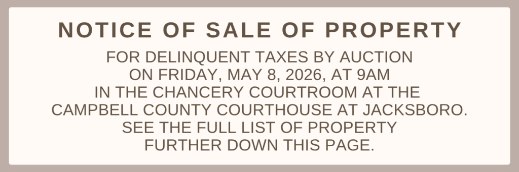 JACKSBORO, TN (SPECIAL TO WLAF)- An auction conducted by the Campbell County Clerk & Master’s Office will be held on Friday, May 8, 2026, at 9am, at the courthouse to sell property that’s left on the list of delinquent property taxes for the year 2023 and any previous outstanding years. See the full list further down this page and click the download tab at the bottom of the page.