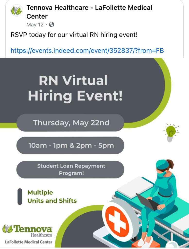 This is a virtual hiring event for prospective registered nurses, part-time and full-time