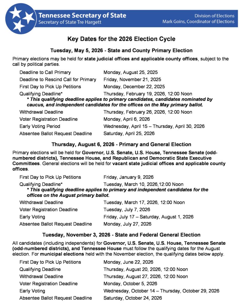 Candidates will have until Feb. 19, 2026, to qualify. For those who aren’t affiliating with a party, they can pick up petitions starting Jan. 9 and qualify by March 10 for the general election in August 2026. Voter registration deadline will be Mon., April 6, 2026.