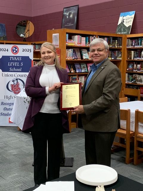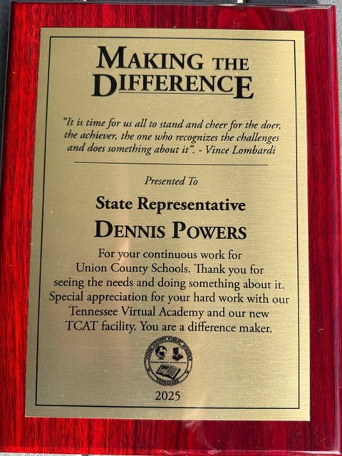 MAYNARDVILLE, TN (SPECIAL TO WLAF)- On Monday, State Representative Dennis Powers received a “Making the Difference” award from the Union County School Board during a large gathering at Union County High School.