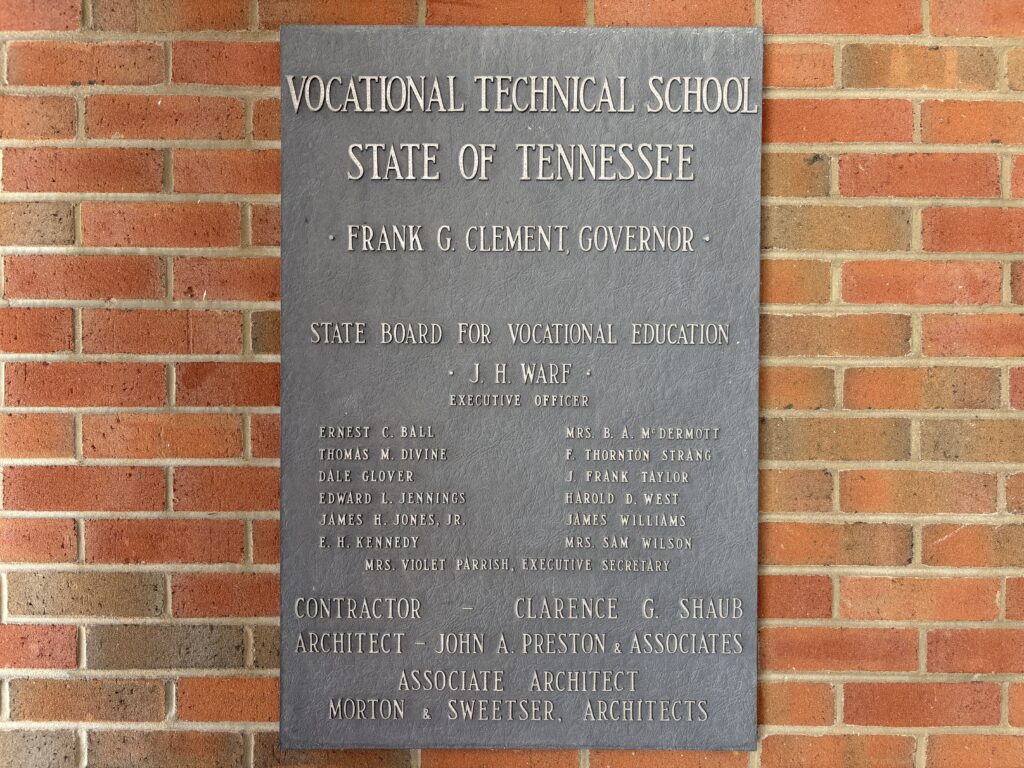 The statewide network of Area Vocational-Technical Schools in Tennessee began to be established in the 1960s, driven by Governor Frank G. Clement and Commissioner of Education J. Howard Warf following the federal Vocational Education Act of 1963. This plaque was placed in the lobby of the original TCAT building when it opened as the area vocational-technical school in 1967.