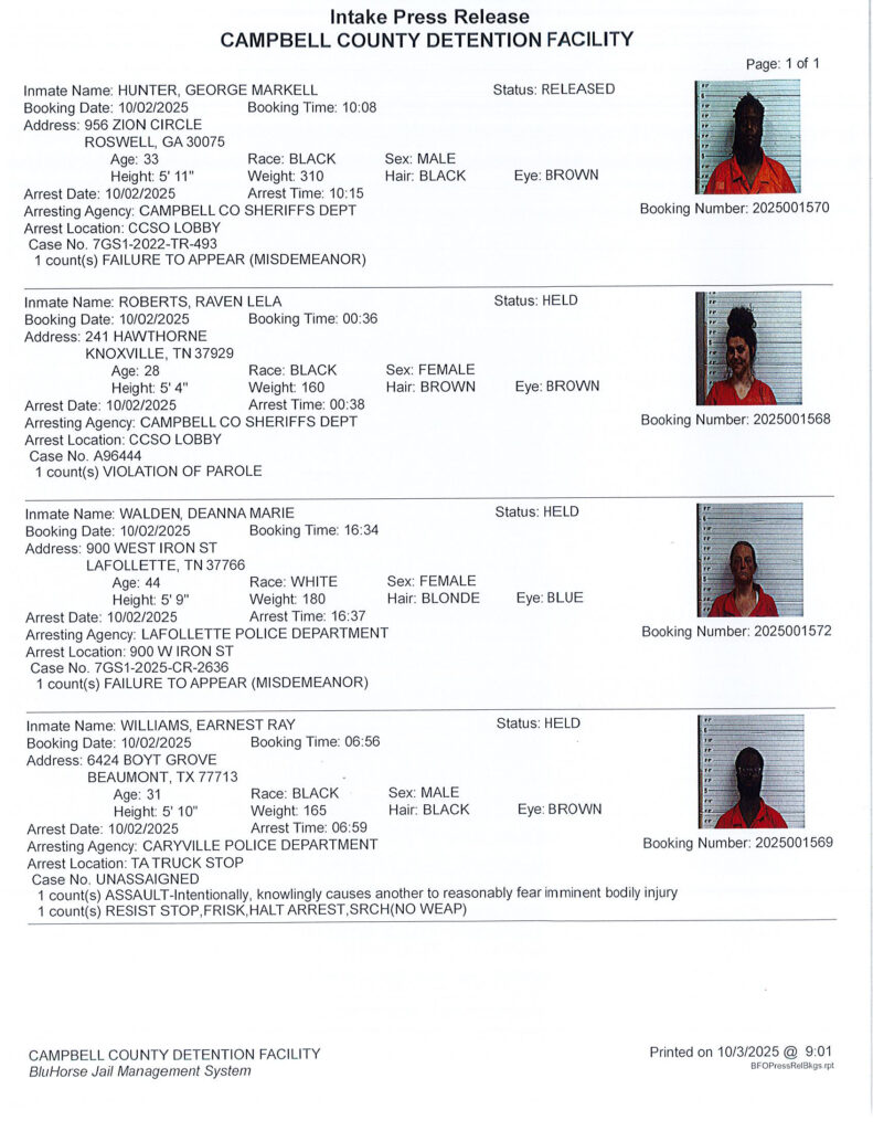 - Nine names on the Thu., Oct. 2, 2025, B.C. Bonding Arrest Report. B.C. Bonding 423-563-0065.