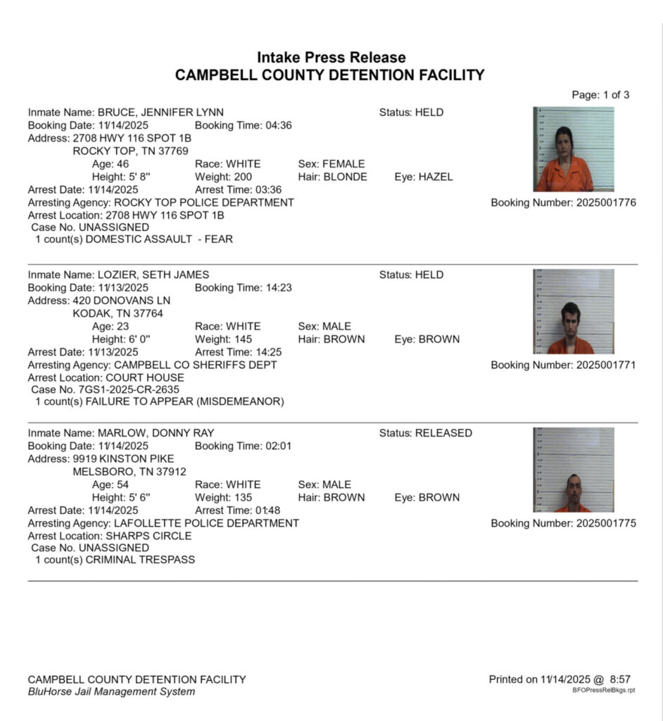 - Four names on the Tue., Nov. 11, 2025, B.C. Bonding Arrest Report. B.C. Bonding 423-563-0065.
