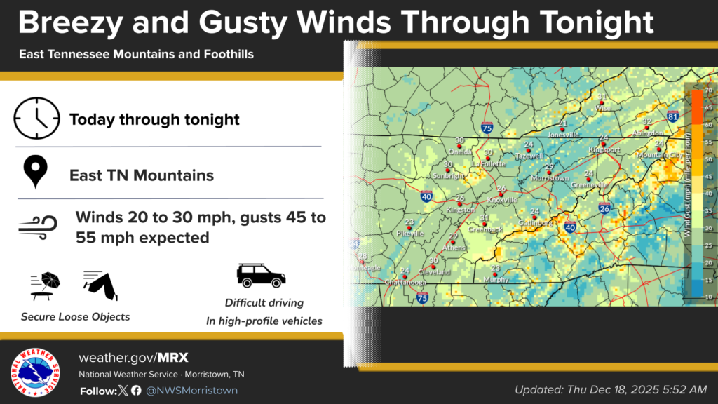Strong gusty winds up to 55 mph will be possible in the East Tennessee mountains and immediate foothills Thursday afternoon into Thursday night. There will be breezy winds in Campbell County and here on the northern Cumberland Plateau approaching 40 mph gusts. (WLAF NEWS PUBLISHED-12/18/2025-6AM-IMAGE AND SOME TEXT COURTESY OF NWS MORRISTOWN)
