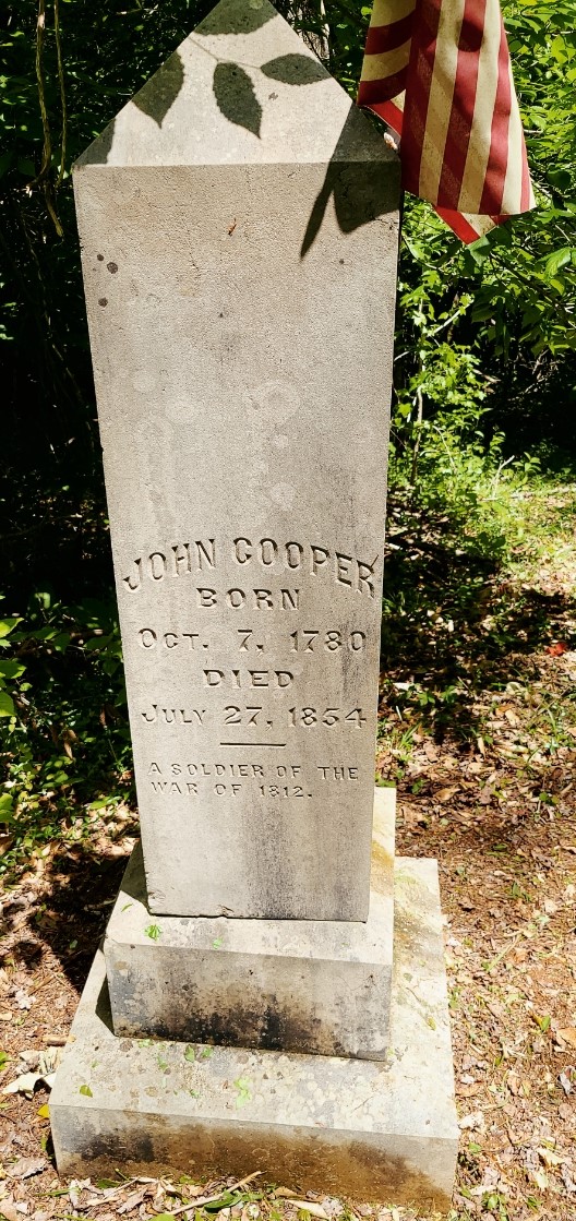 This is the tombstone of John Cooper, a solider of the War of 1812. Cooper was laid to rest here in Campbell County at the Cooper View Cemetery at Pinecrest. He was born October 7, 1780, and died July 27, 1854.