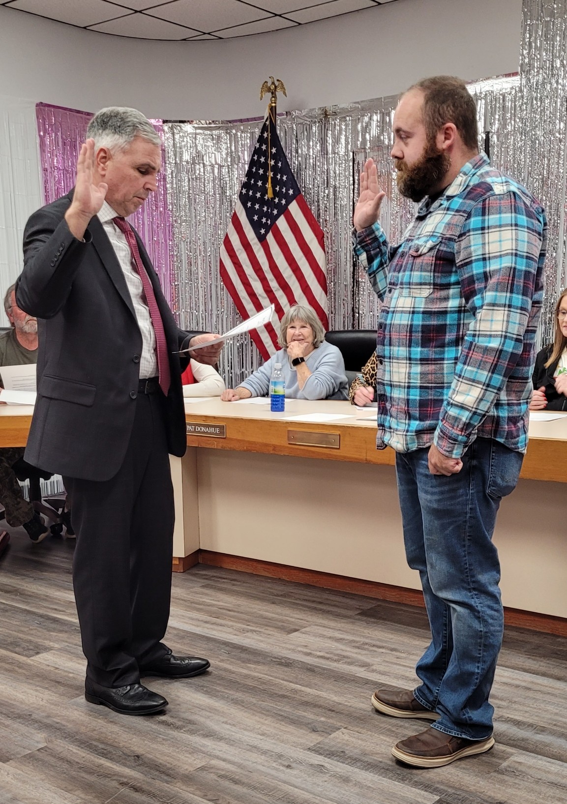 VERY TOP PHOTO: Prior to the special called meeting Jordan Cross was sworn in as alderman by Town Judge Reid Troutman.
