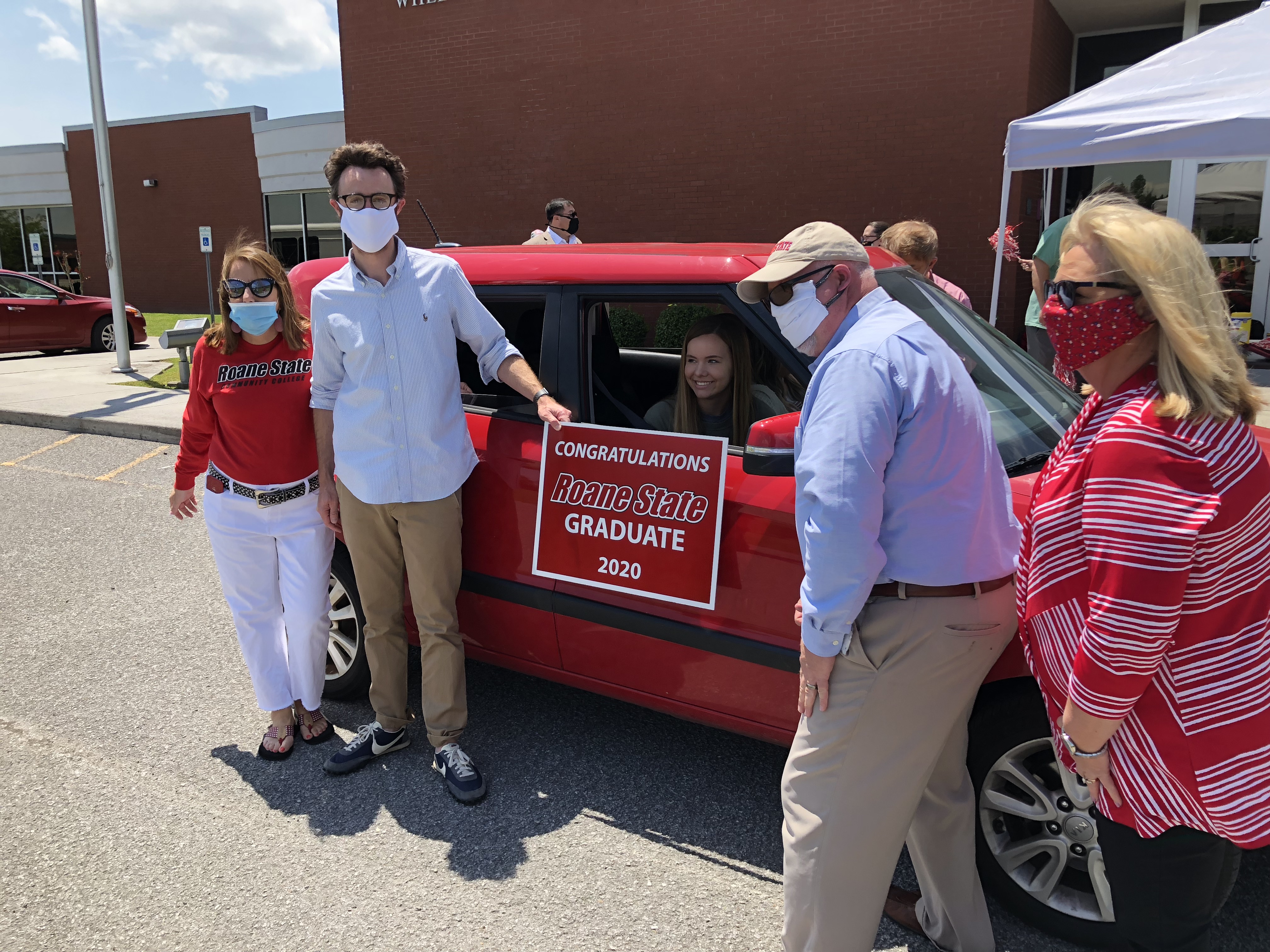 TOP PHOTO: In the car – Masynn Galyon, with her best friend McKinley Fritts, receive their yard signs celebrating their graduation from Roane State Community College. Left to right are RSCC La Follette Director Tracy Powers, English Professor Turner Bowling, RSCC President Chris Whaley and Vice President of Academics Diane Ward making the presentation.