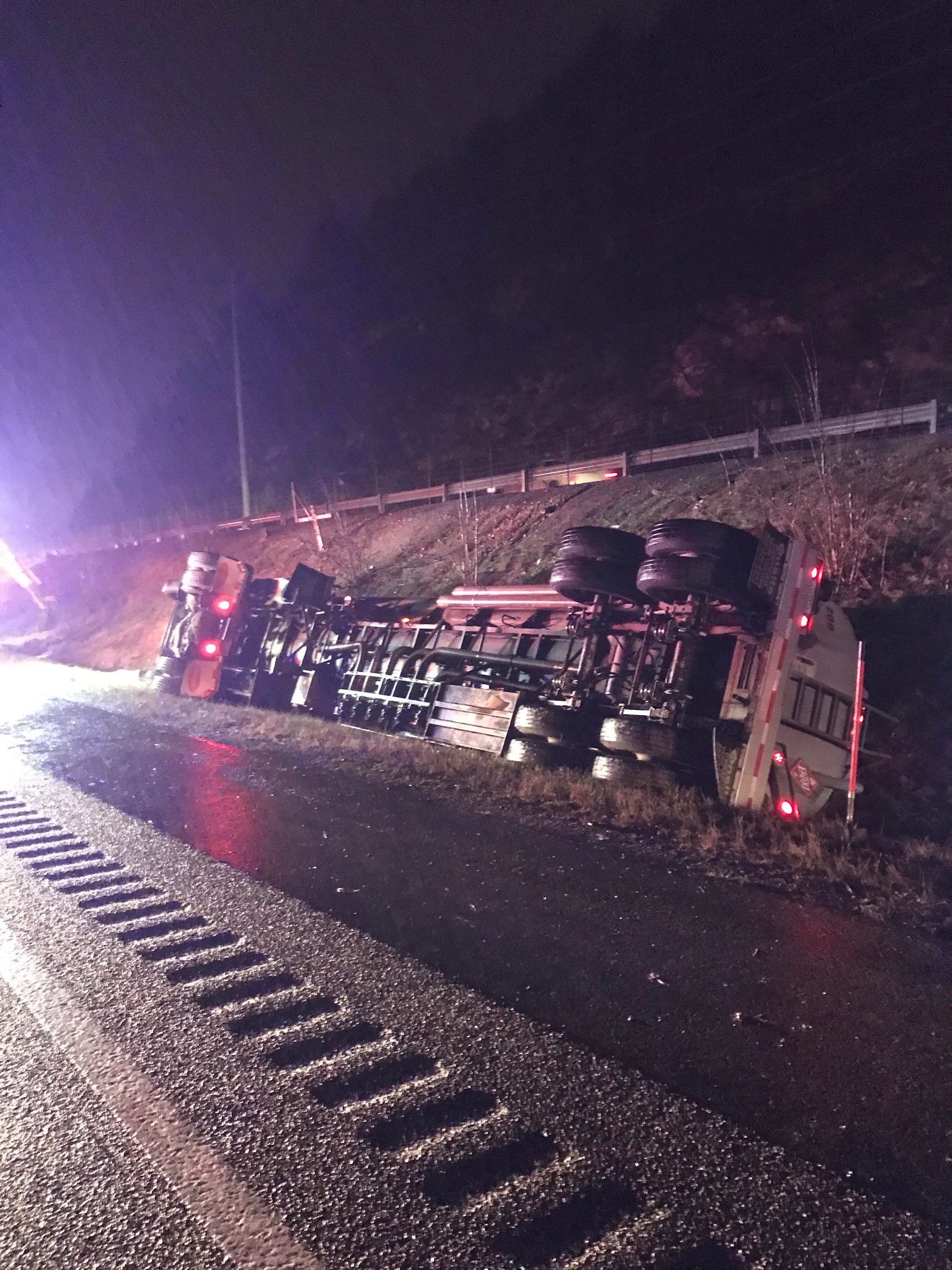An 18-wheeler turned over in a ditch on I-75 in Campbell County on a rainy Friday night at 7:43 pm.   It’s carrying 8,500 gallons of fuel.Â