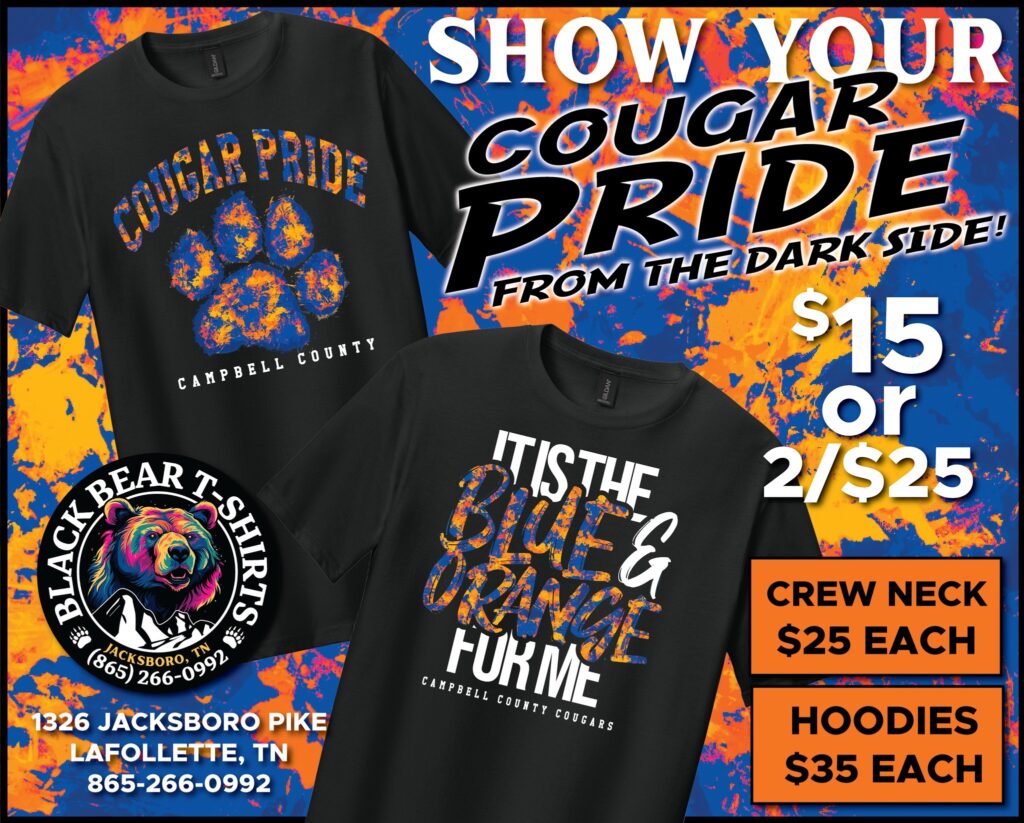 CAMPBELL COUNTY, TN. (WLAF)- Black Bear T-shirts in LaFollette is dedicated to creating original shirts. Just in time for football they have Cougar Pride shirts and hoodies. Shirts are $15 each or two for $25. Hoodies are available for $35 each.