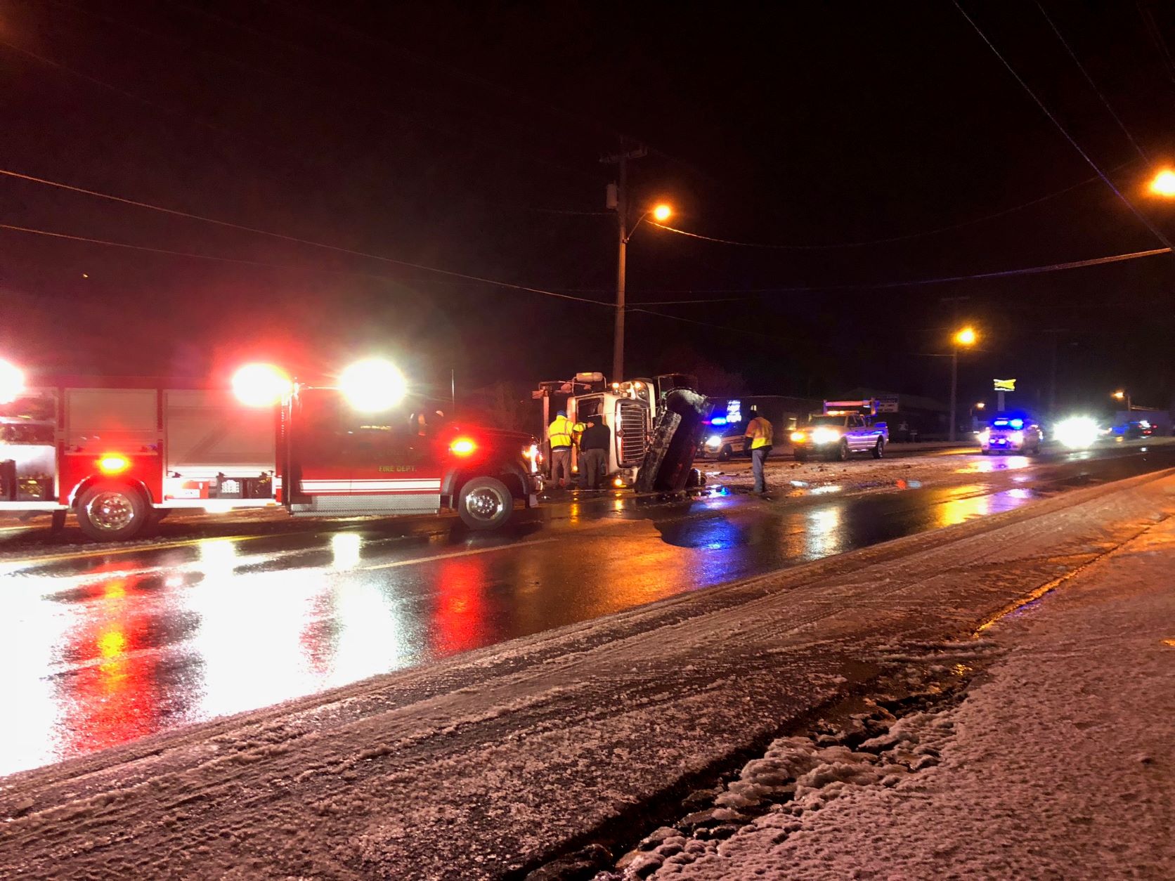 TOP PHOTO: A TDOT salt/plow truck overturned in the 2am hour Monday on West Central Avenue at 13th Street between E.E. Hill & Son Insurance and Martin Wilson Funeral Home. The road has since been reopened.