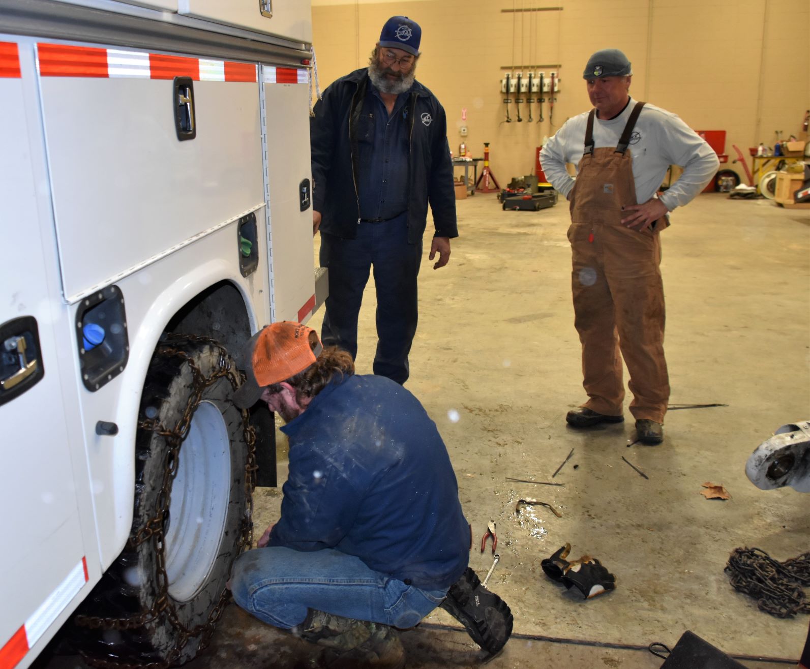 TOP PHOTO: Charlie Cooper is putting chains on this LUB truck along with Patrick Angle and Richard Goodman. Richard is getting ready to head to the top of Walnut Mountain. There were reports of about 8 inches of snow and a power outage on Walnut Mountain (PHOTO COURTESY OF WLAF’S CHARLIE HUTSON).