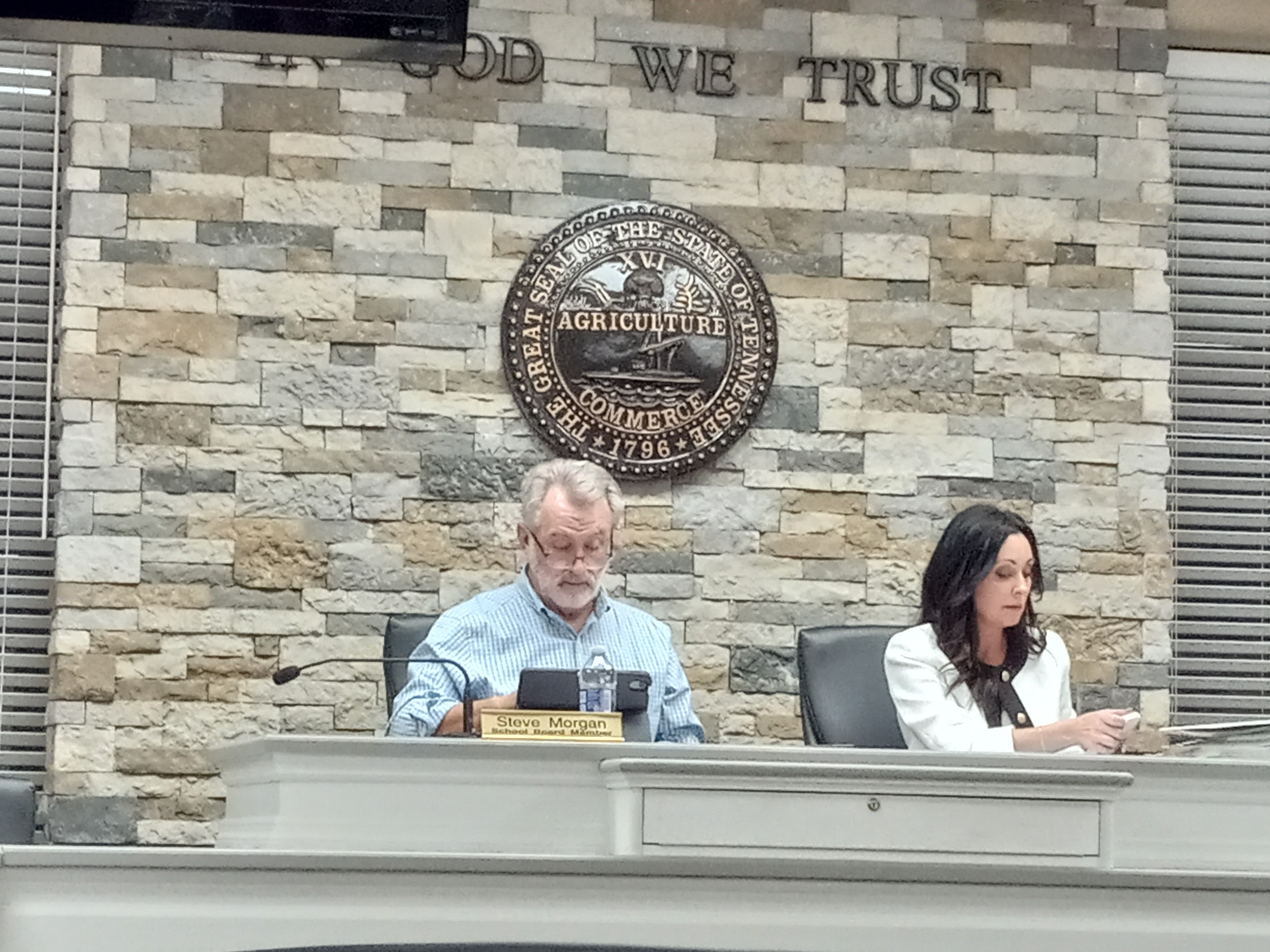 TOP PHOTO: The Campbell County Board of Education met Tuesday evening, voting to give bonuses to full time and part time employees, as well as bus drivers. School board chair Steve Morgan (left) and Director of Schools Jennifer Fields (right) at Tuesday’s School board meeting.