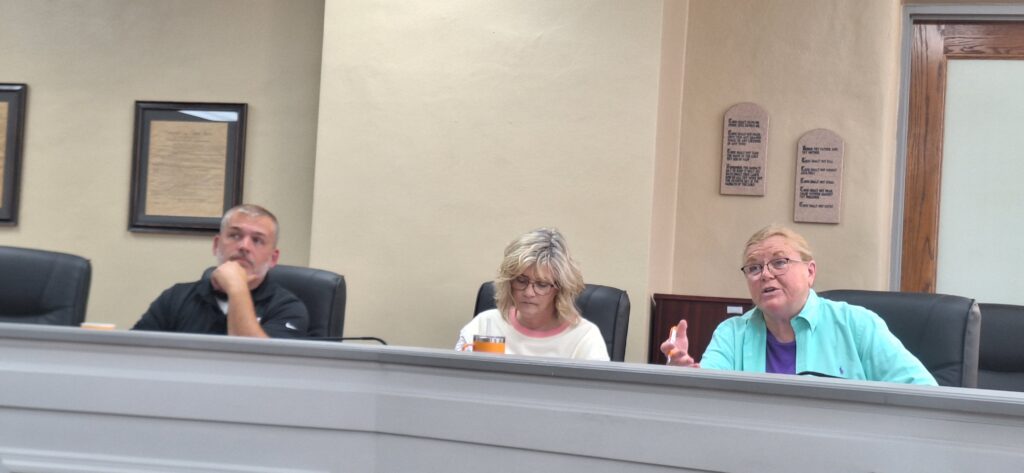 BOE members Ryne Cummins, Crystal Creekmore and Jamie Wheeler at Wednesday’s BOE meeting. The board passed an initial “base” option for the budget that includes over $1.6 million in budget cuts and the abolishment of multiple teaching positions across the county. Budget talks will resume on Monday at 5:30.
