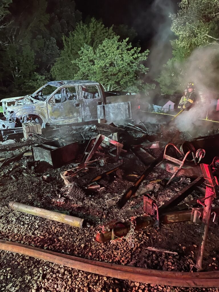 At 12:19am, the call of an out building and truck fire (photo below) came in to Central Dispatch, according CVFD Chief Eddie Hatmaker. Fire units responded to Bruce Gap Road. The truck was a total loss and the building was destroyed. There were no injuries as all units cleared the scene around 2am.