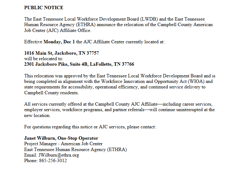 CAMPBELL COUNTY, TN. (WLAF)- The East Tennessee Local Workforce Development Board (LWDB) and the East Tennessee Human Resource Agency (ETHRA) announce the relocation of the Campbell County American Job Center (AJC) Affiliate Office.