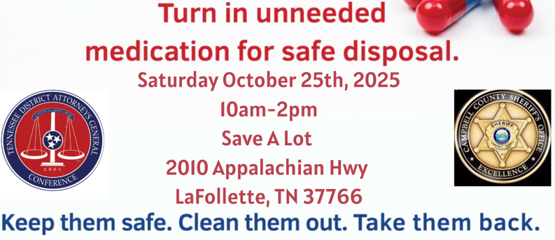 LAFOLLETTE, TN (WLAF)- Campbell United has a drug take-back event scheduled for Sat., Oct. 25, in La Follette.