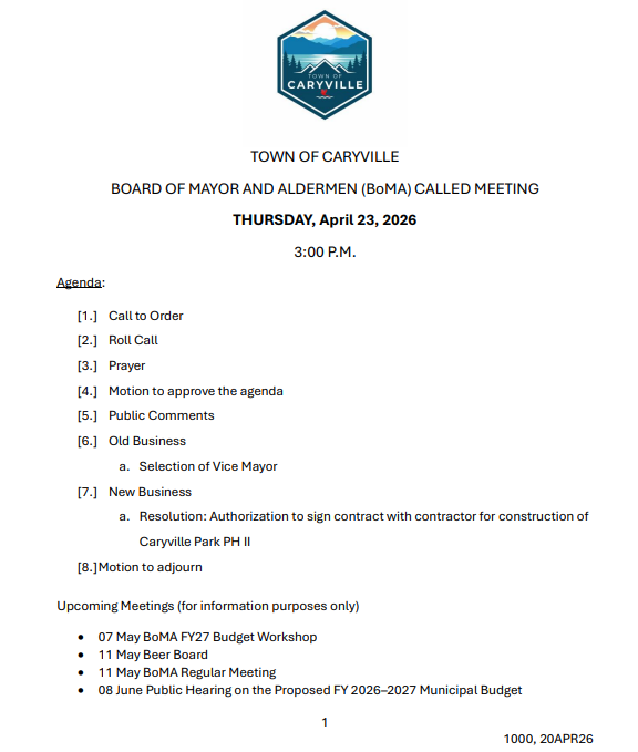 The Town of Caryville Mayor and Board of Aldermen has called a meeting for Thursday at 3pm at the Municipal Building. One of the items on the agenda is the vice mayor vacancy.