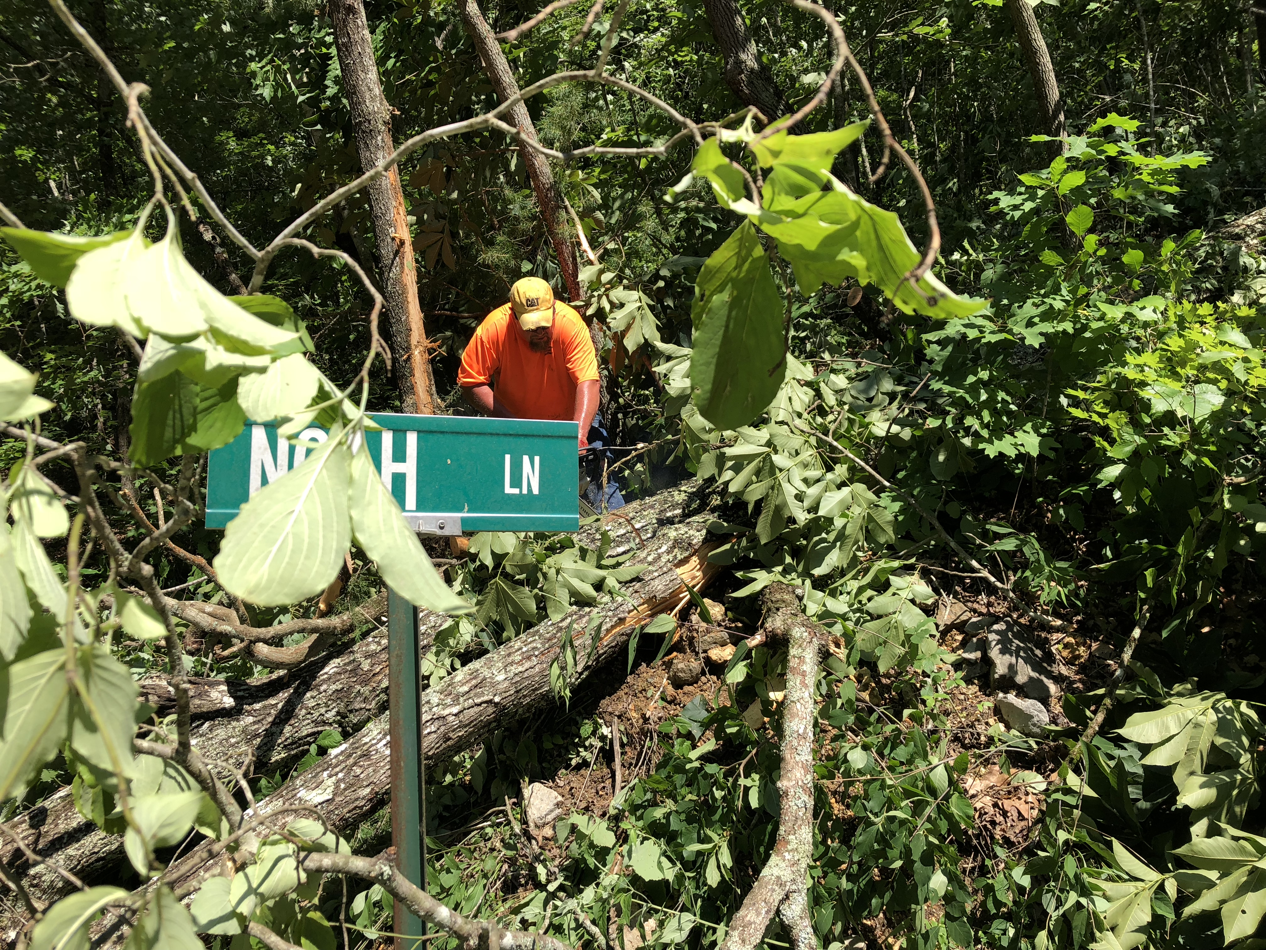VERY TOP PHOTO:  Darrell Johnson with the CCHD cuts large trees where Noah Lane meets Glade Springs Road.  CCHD crew members as well as LUB crew members called this one of the hardest hit areas.