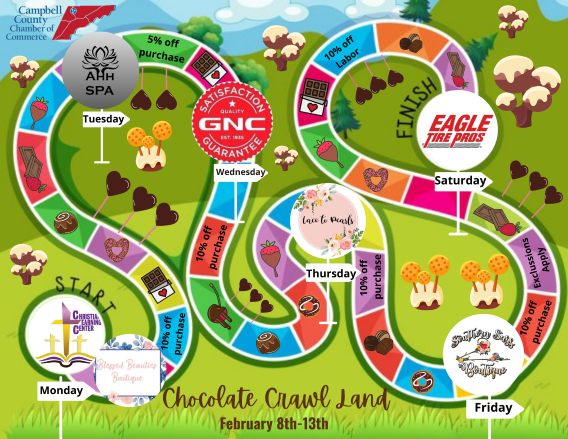 JACKSBORO, TN (WLAF) – The Campbell County Chamber of Commerce Chocolate Crawl’s first stop this week is today at the Campbell County Christian Learning Center featuring Blessed Beauties Boutique running from 1 pm – 6 pm.