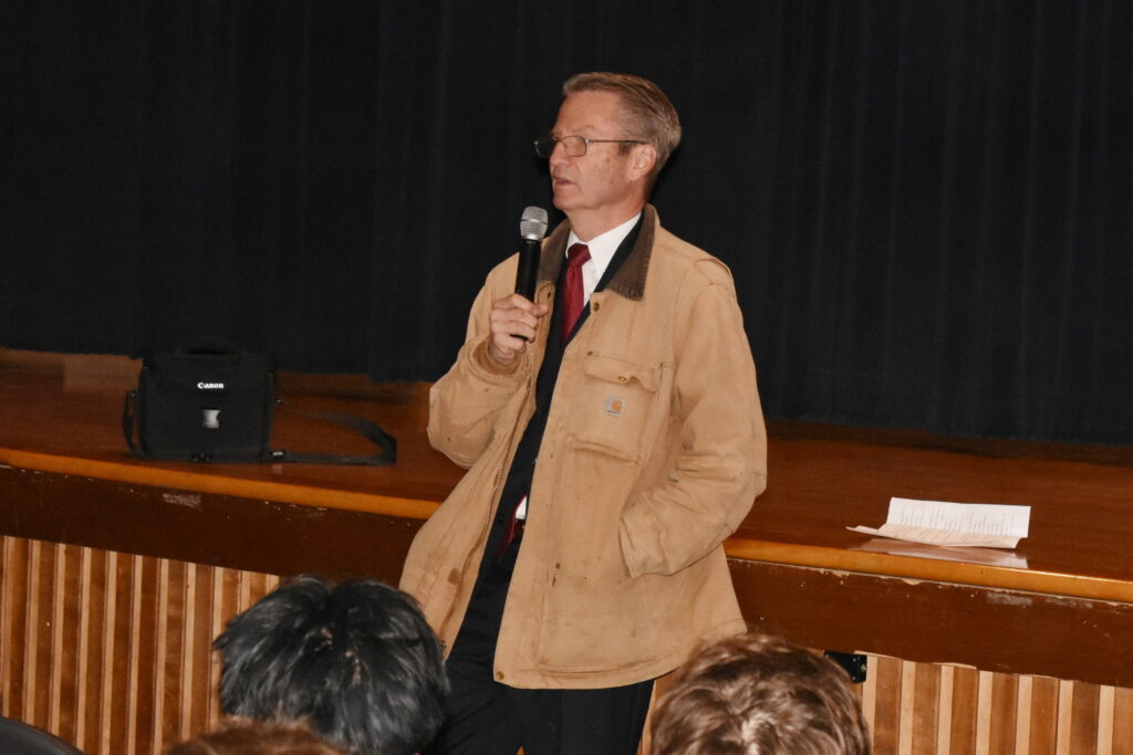 Congressman Tim Burchett leans against the stage in the Campbell High Auditorium as he speaks to students.
