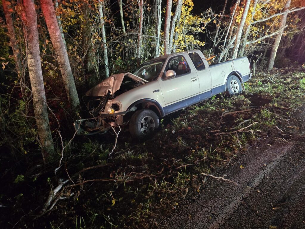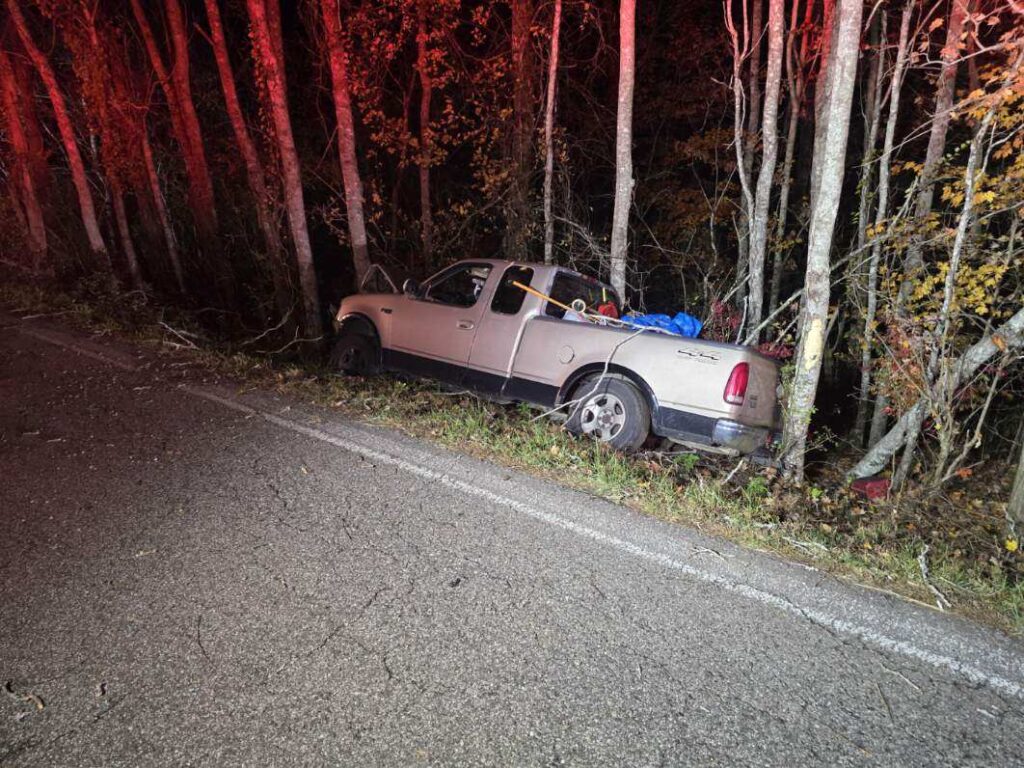 When first responders arrived on the scene near the Bakers Forge Cemetery entrance, no one was to be found, only a wrecked pick up truck. (WLAF NEWS PUBLISHED-11/05/2025-6AM)