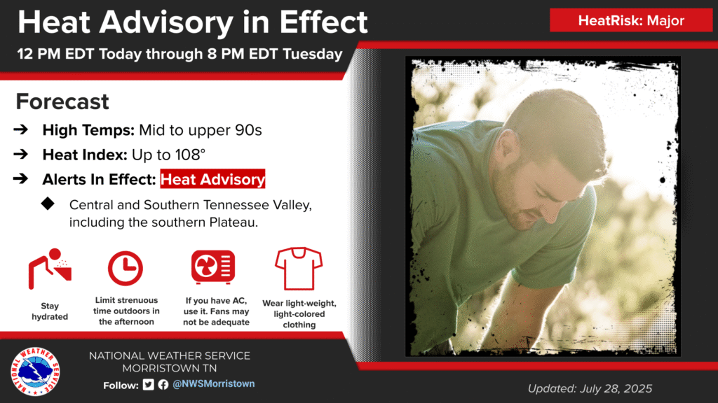 LAFOLLETTE, TN (WLAF)- There is a HEAT ADVISORY for counties north, south and west of Campbell County in effect through 8pm Tuesday for heat indices as high as 107°F.