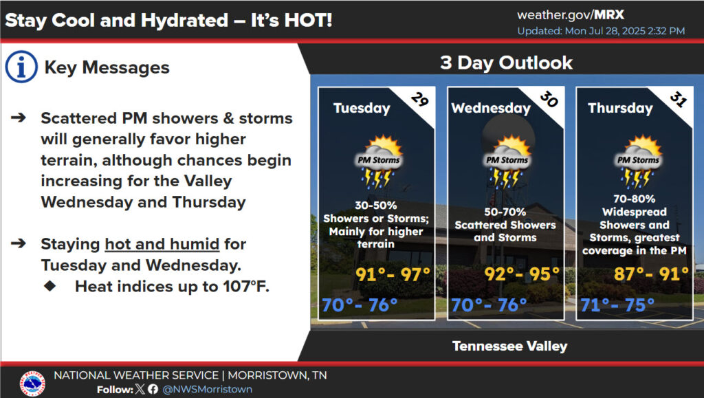 “Cooler” temps arrive for this weekend with highs in the upper 70s to mid 80s as shower and storm chances remain. (WLAF NEWS PUBLISHED-07/29/2025-6AM-IMAGES COURTESY OF THE NWS MORRISTOWN)