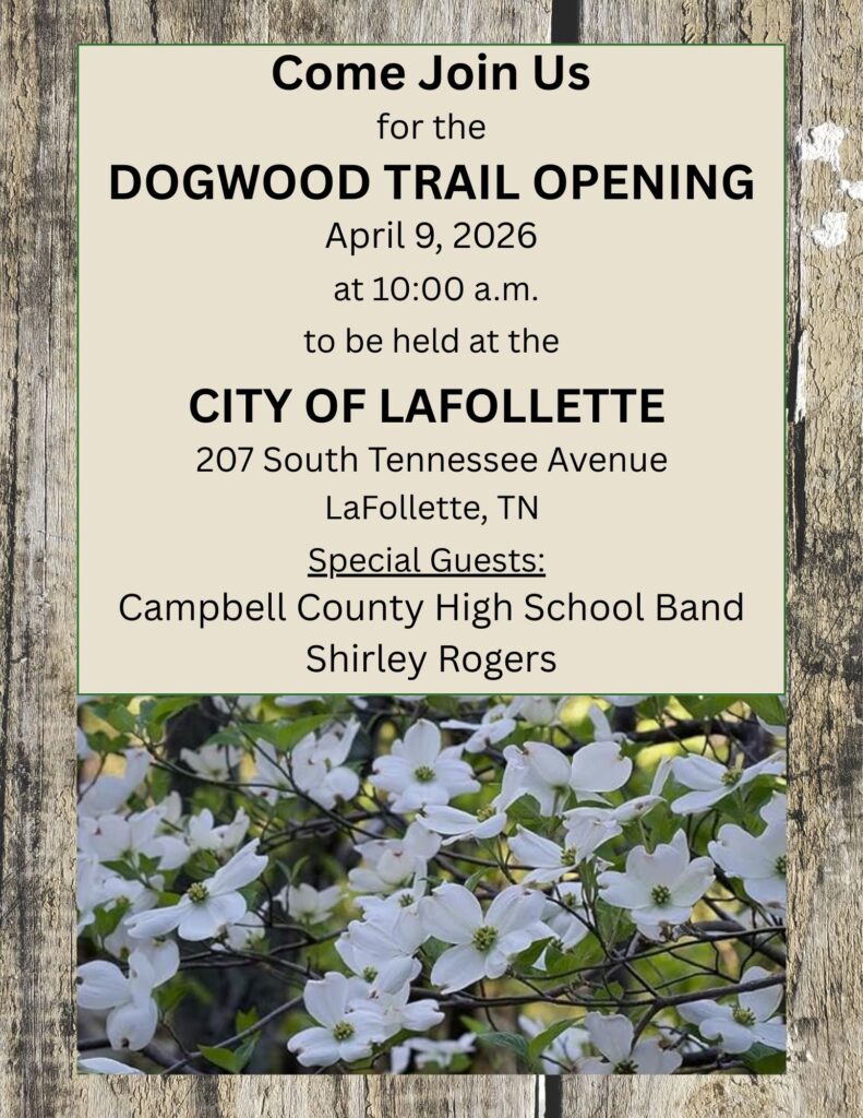 LAFOLLETTE, TN. (WLAF)- The City of LaFollette Dogwood Trails will open April 9 at 10am.