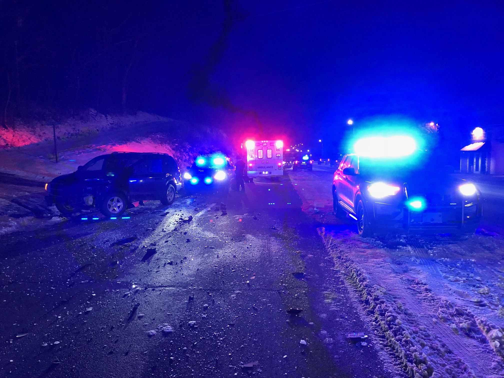The SUV was coming down an icy College Hill Road, according to the driver. The car was traveling east toward La Follette on the four lane, and the two vehicles collided.