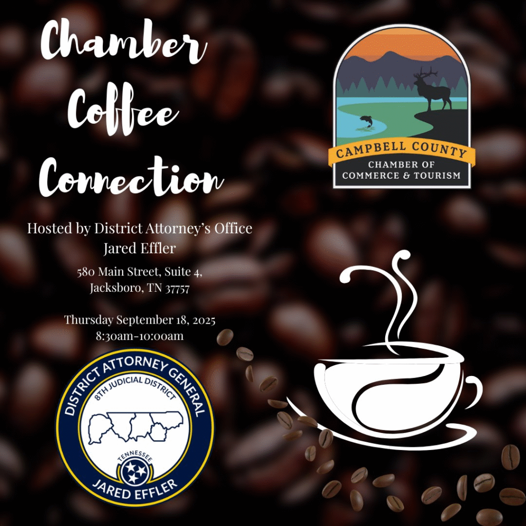 JACKSBORO, TN (SPECIAL TO WLAF)- “Join us this week, Thursday, September 18, for the September Chamber Coffee Connection with our host District Attorney’s Office-Jared Effler,” said Missy Tackett, Executive Director of the Campbell County Chamber of Commerce and Tourism.