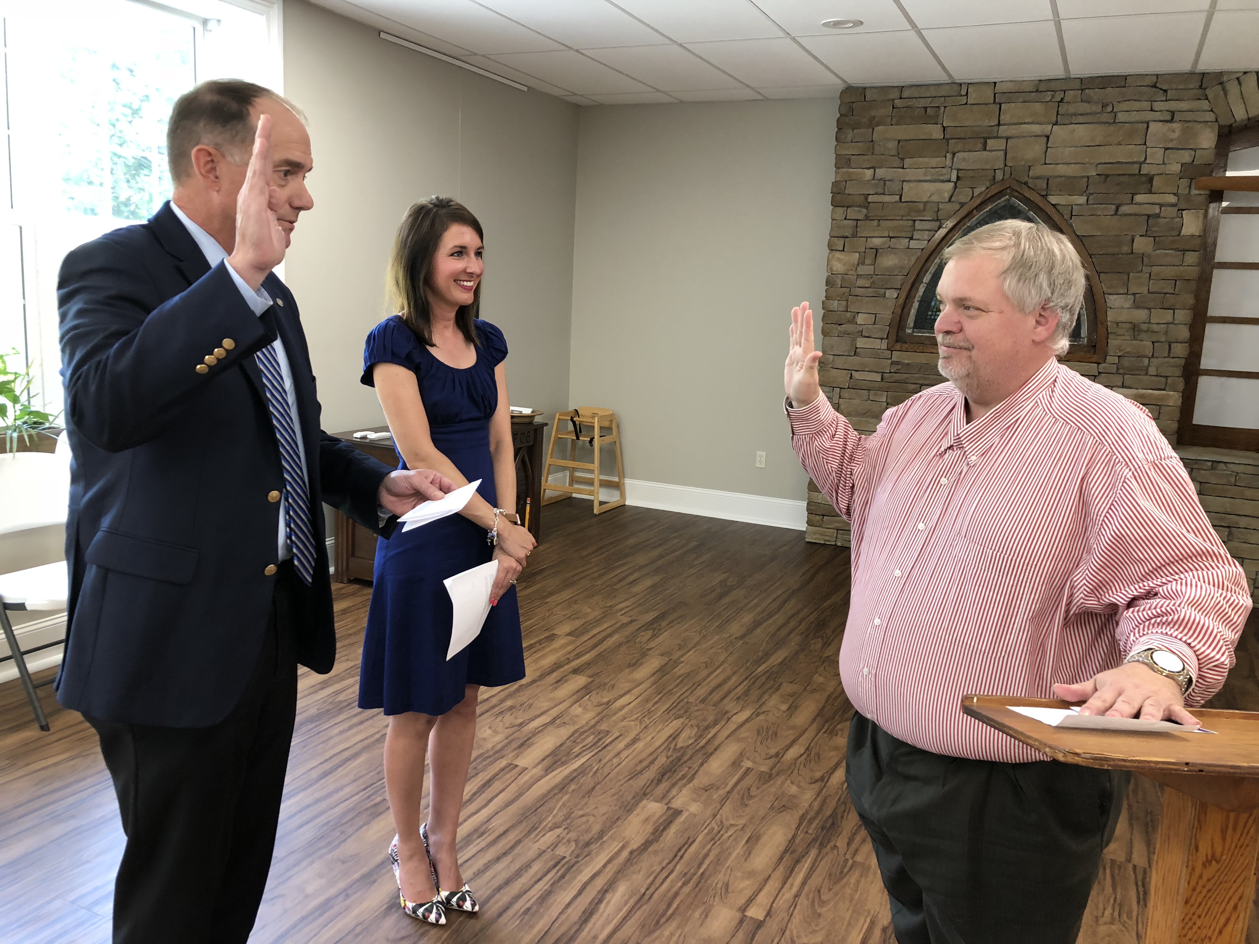 TOP PHOTO:Â Logan Hickman (L) swears in new Rotary President Zach Sheets as Christie Elkins looks on.