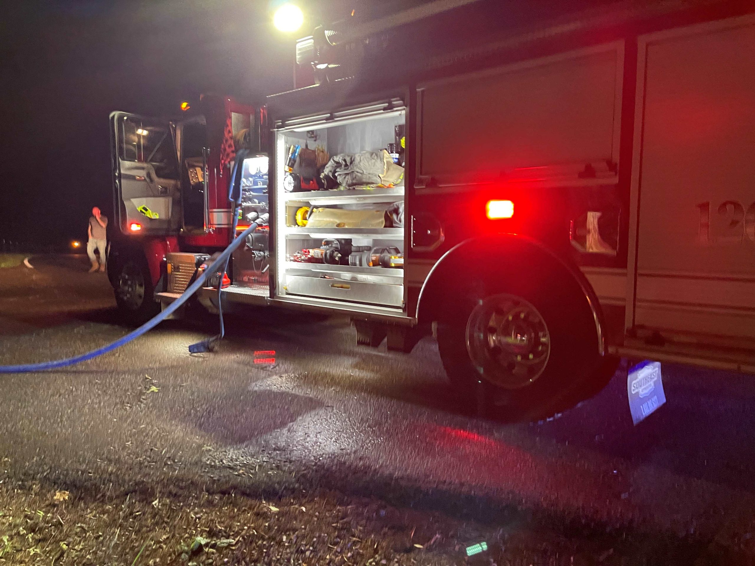 Upon arrival, crews found the truck fully engulfed in flames. All occupants were safely out of the vehicle, and there were no injuries.