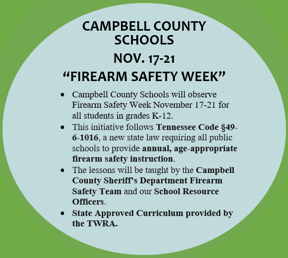 Campbell County Schools will observe Firearm Safety Week November 17-21 for all students in grades K-12. This initiative follows Tennessee Code §49-6-1016, a new state law requiring all public schools to provide annual, age-appropriate firearm safety instruction.