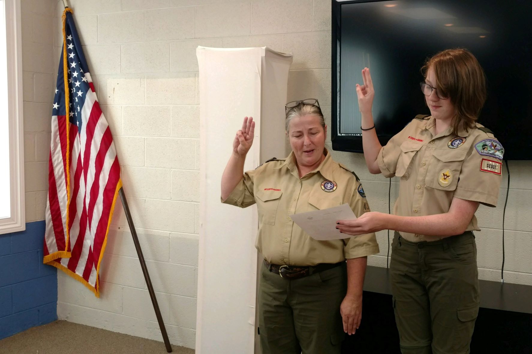 TOP PHOTO: Scout Macy Kibler, right and Troop 435 Scoutmaster Liz White administer the oath to new scouts at the meeting.