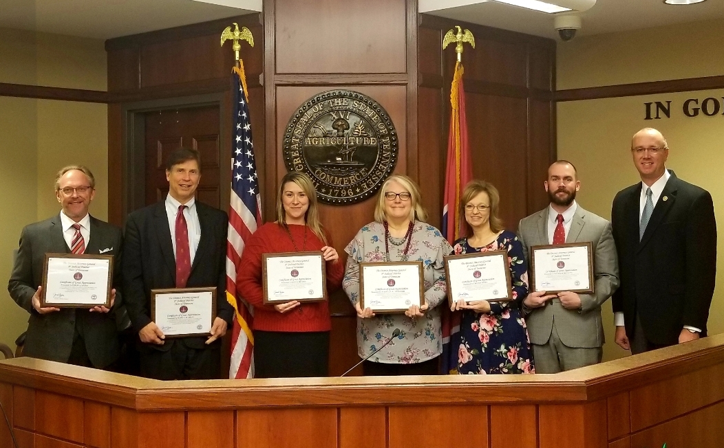TOP PHOTO L-R:Â Assistant District Attorney General Philip Kazee, 5 years of service; Assistant District Attorney General Mark Blakley, 5 years of service; Coordinator Keisha Hughes, 15 years of service; DUI Coordinator Amanda Rutherford, 5 years of service; Child Support Specialist Chanda Posey, 10 years of service; and Assistant District Attorney General Matthew McClung, 5 years of service.