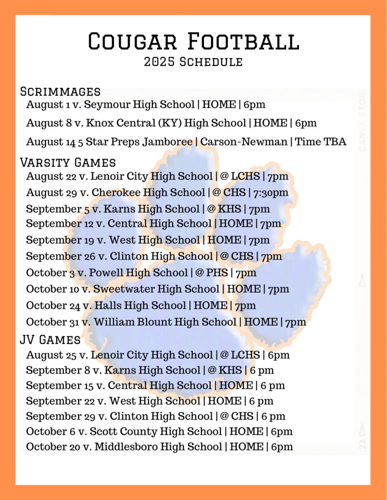 JACKSBORO, TN (WLAF)- The Orange-and-Blue continue preparing for the first regular season game of the year on Friday, August 22, at Lenoir City with a 7pm kickoff, and for their 15th straight season, Les Martin and Brent Allen will bring you the coverage of Cougar Football over the WLAF Doyle’s Tire Sports Network.