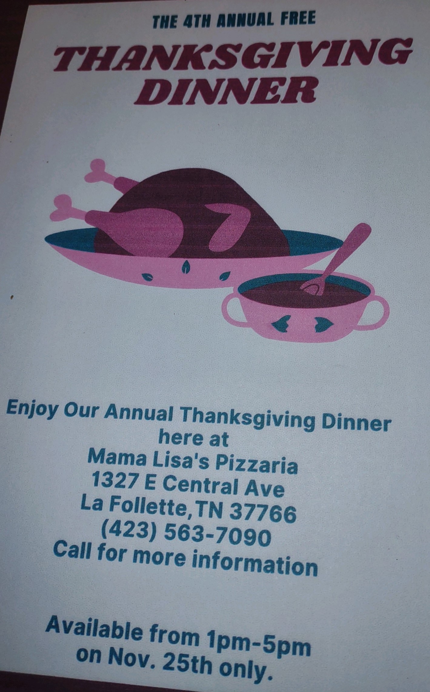 LAFOLLETTE, TN (WLAF) – For the fourth Thanksgiving, Lisa and the folks at Mama Lisa’s Pizzaria are providing free meals.