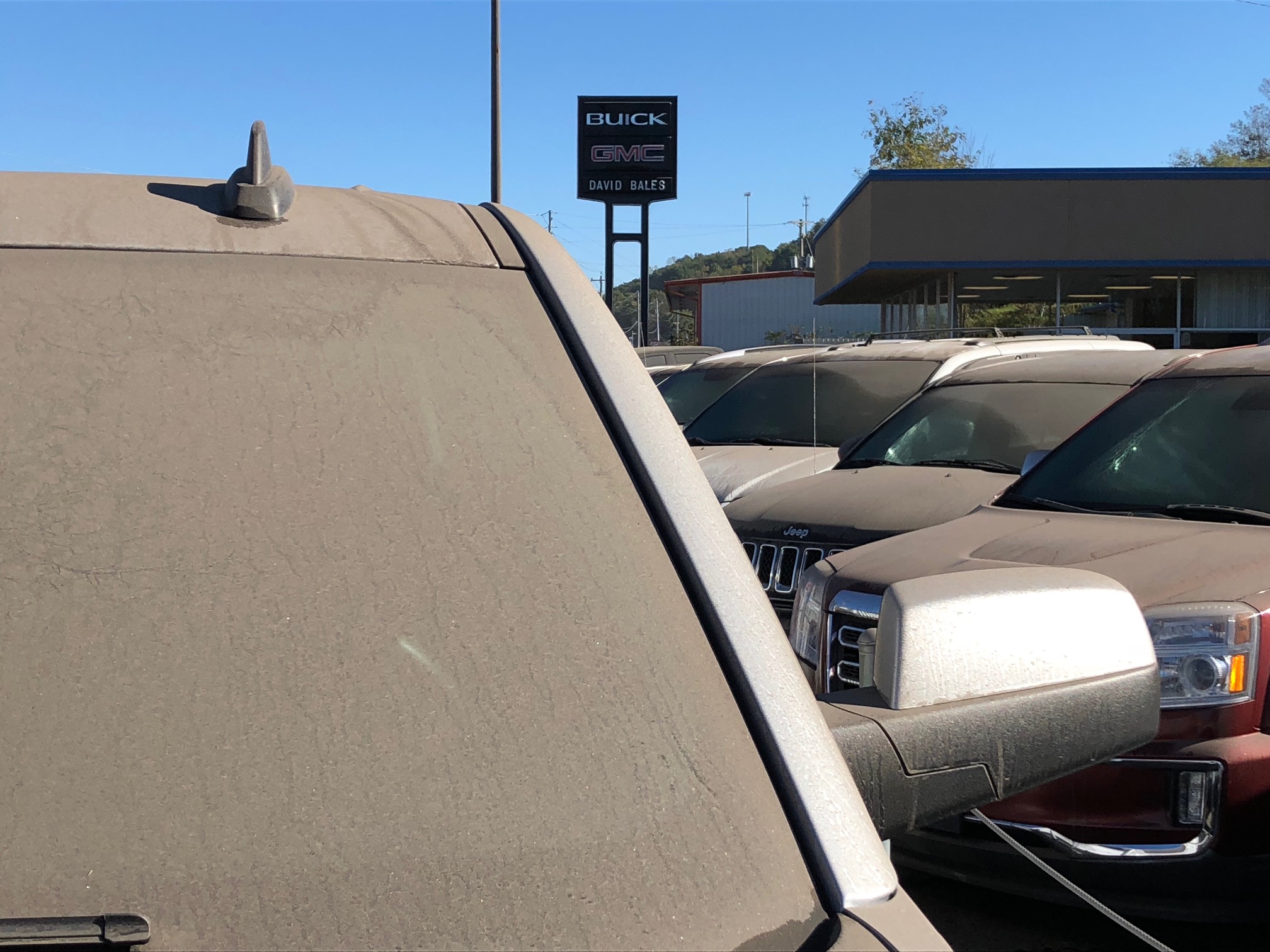 “When a big 18-wheeler comes rolling by here, it’s like the Wild, Wild West with big clouds of dust,” said David Bales, owner of Bales Buick – GMC. TOP PHOTO: Thick dust covers every vehicle on the Bales lot and has for several days