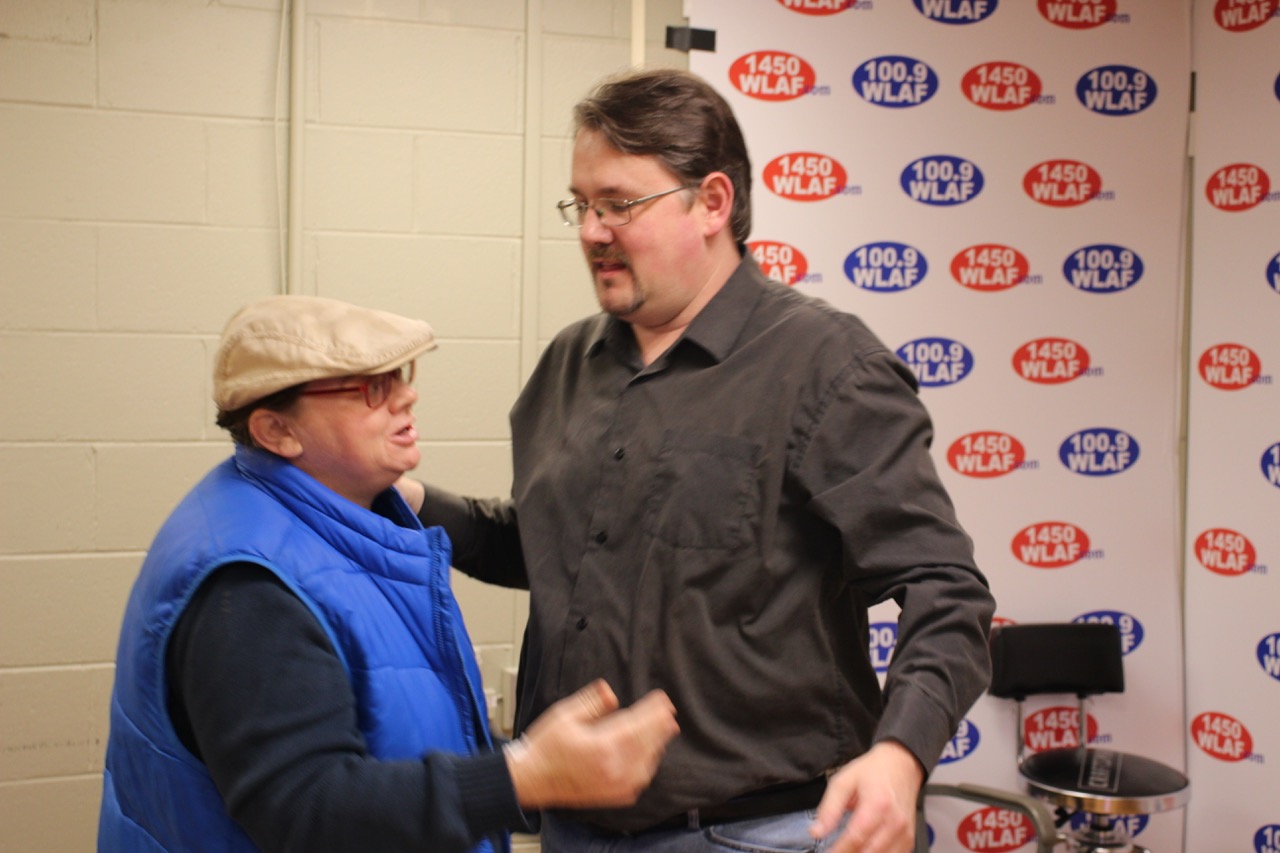 TOP PHOTO: WLAF’s Charlotte Underwood hugs her life long friend, Brian Henegar, during his visit to the WLAF Studios in La Follette on Saturday. The friends started school together at Valley View Elementary School and then all the way through to graduating from Campbell County High School.