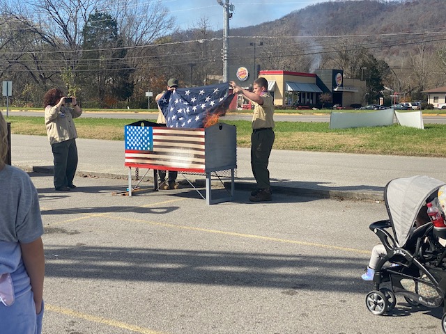 LAFOLLETTE, TN (WLAF) – Boy Scouts of America Troop 310-Cedar Hill Baptist Church marked its fifth year last month, and on Saturday, the troop held its first US flag retirement and veteran recognition ceremony at Woodson Mall – Food City Center. In the middle of the day under a sunny sky, people dropped off their worn flags, and scouts honorably retired the flags.