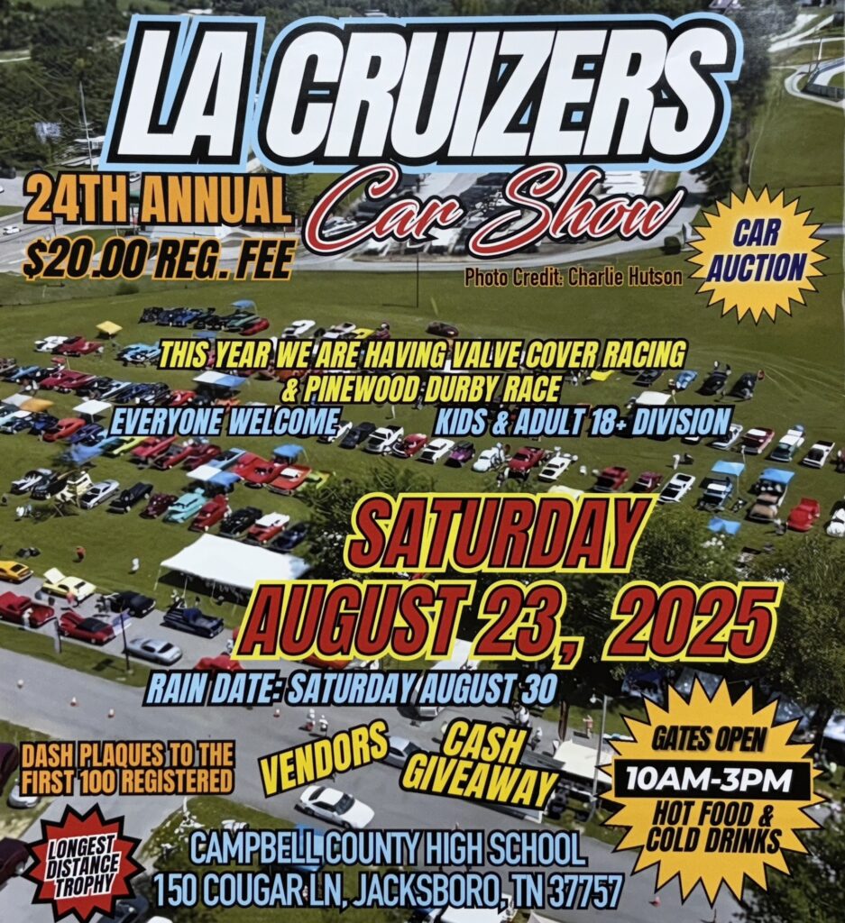 JACKSBORO, TN (WLAF)- Classic cars, hot food and cold drinks are the order of the day come Saturday, August 23, at the 24th annual LA Cruizers Car Show. Admission is free.