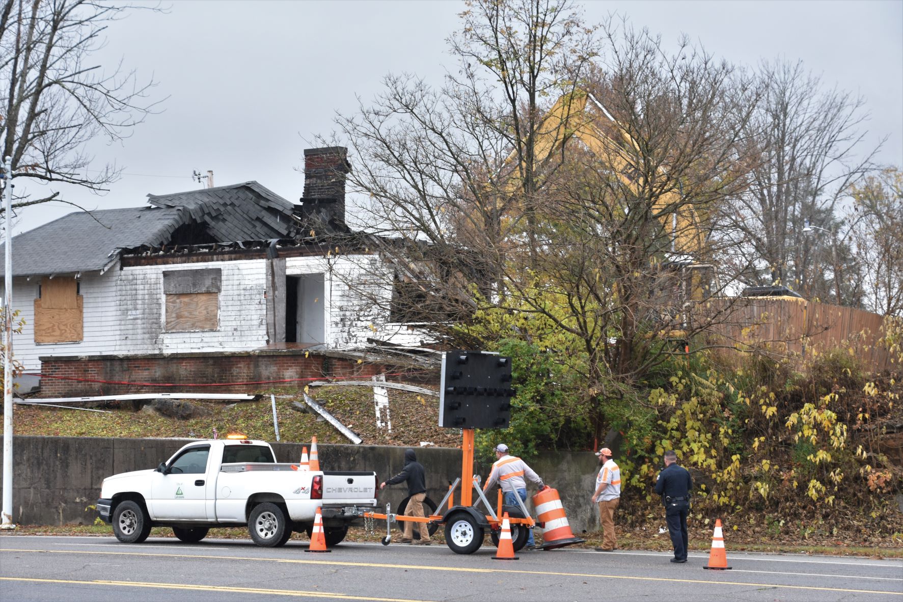 TOP PHOTO: A La Follette Public Works crew begins the shutdown of one lane of traffic ahead of the razing of the Balloff home on Monday morning.