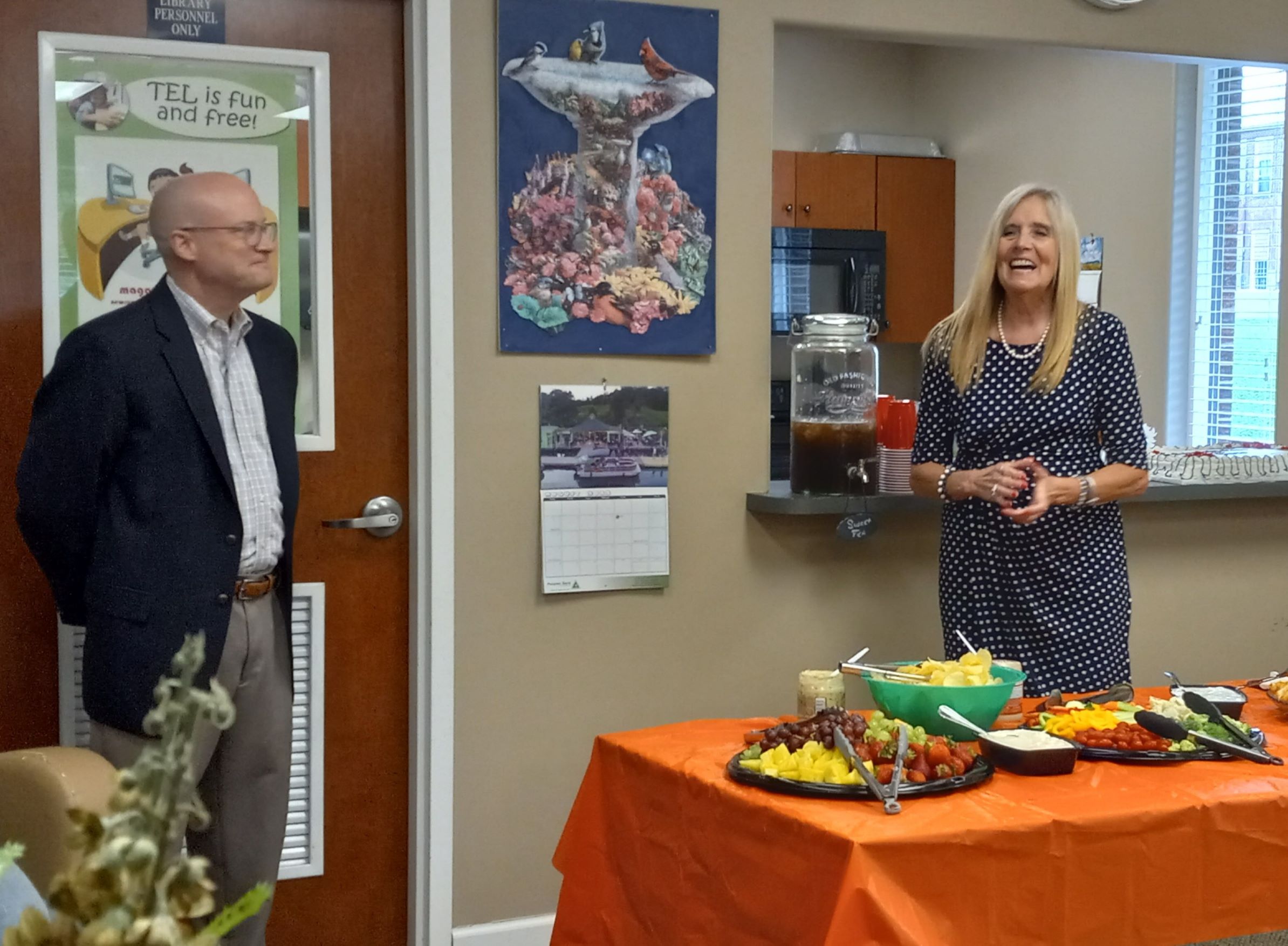 TOP PHOTO: LaFollette Librarian Nancy Green was all smiles at the 10th anniversary celebration of the Library’s new location. At left is Clinch Powell Regional Library Director Matthew Jordan who was also in attendance for the event.