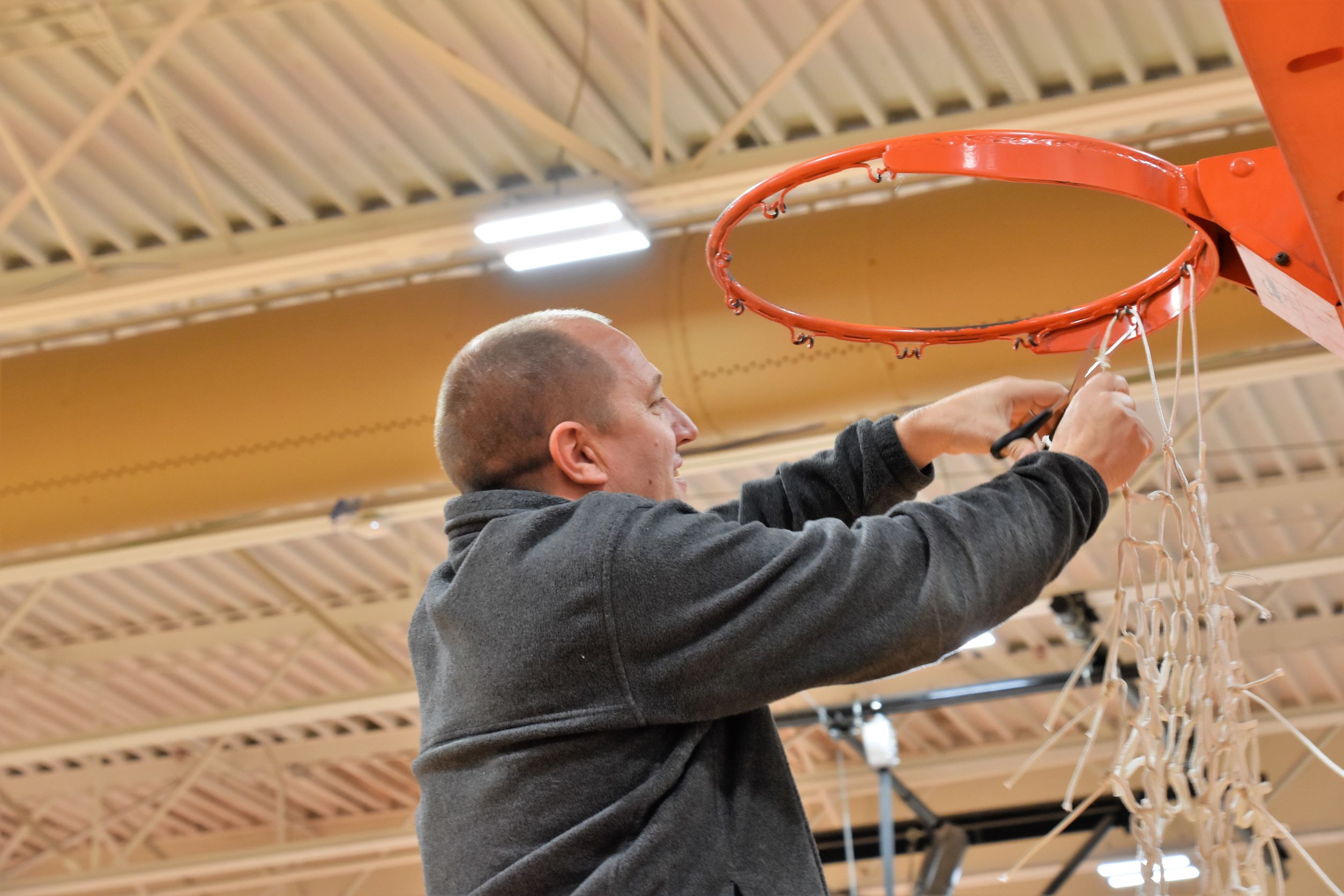 Each player, along with Coach Ken Weaver and Assistant Coach Jody Hatmaker, climbed the ladder and cut a piece of the net down to keep as a memento. Honorary Owl Jaden Wright was also given a piece of the net.