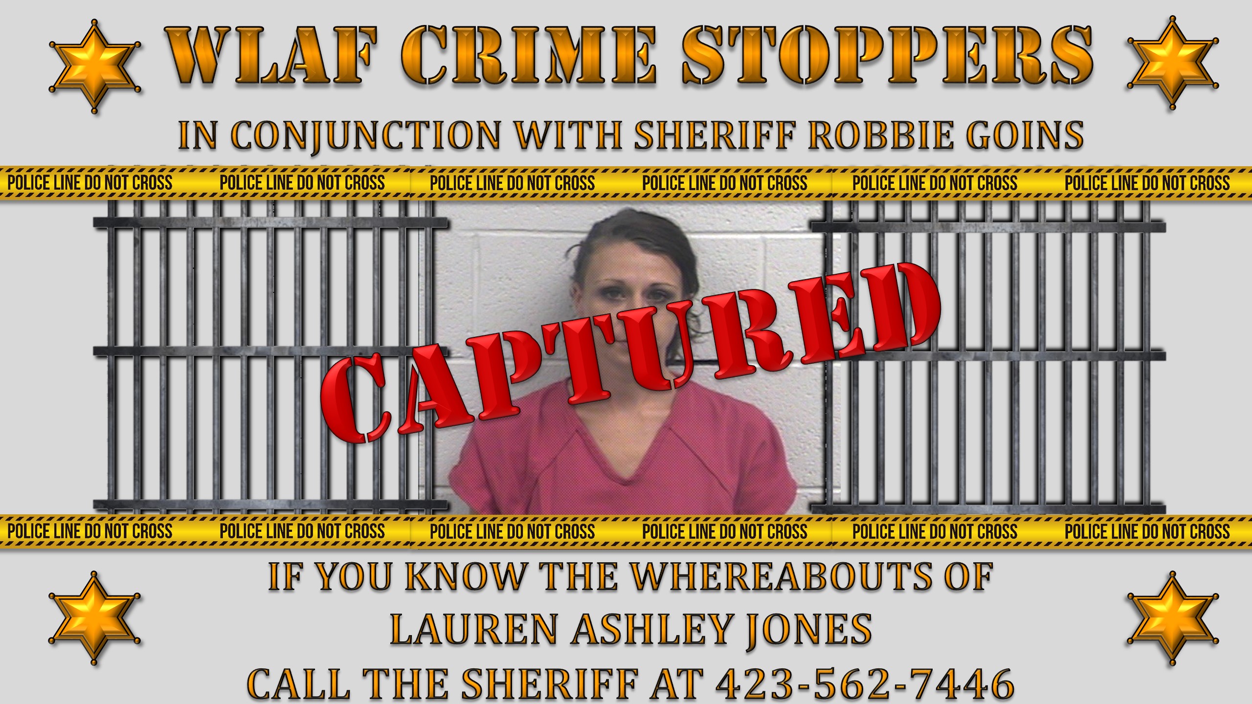 Lauren Jones is in custody. Jones has been featured over the past week in WLAF’s Crime Stopper series. Campbell County Sheriff Department’s Chief Deputy, Jeremy Goins, tells WLAF that Jones was arrested at 3:15 pm on Wednesday at a home up the valley at 136 Log Home Lane in La Follette. Goins says that deputies received information of Jones’ location just prior to her arrest.