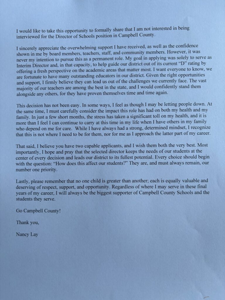 JACKSBORO, TN (WLAF)- Interim Director of Campbell County Schools Nancy Lay has decided not to take part in Friday’s interview process for a new director of schools for Campbell County.
