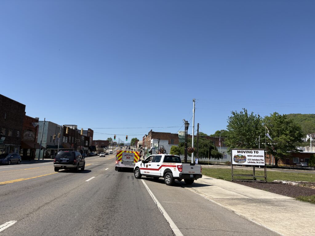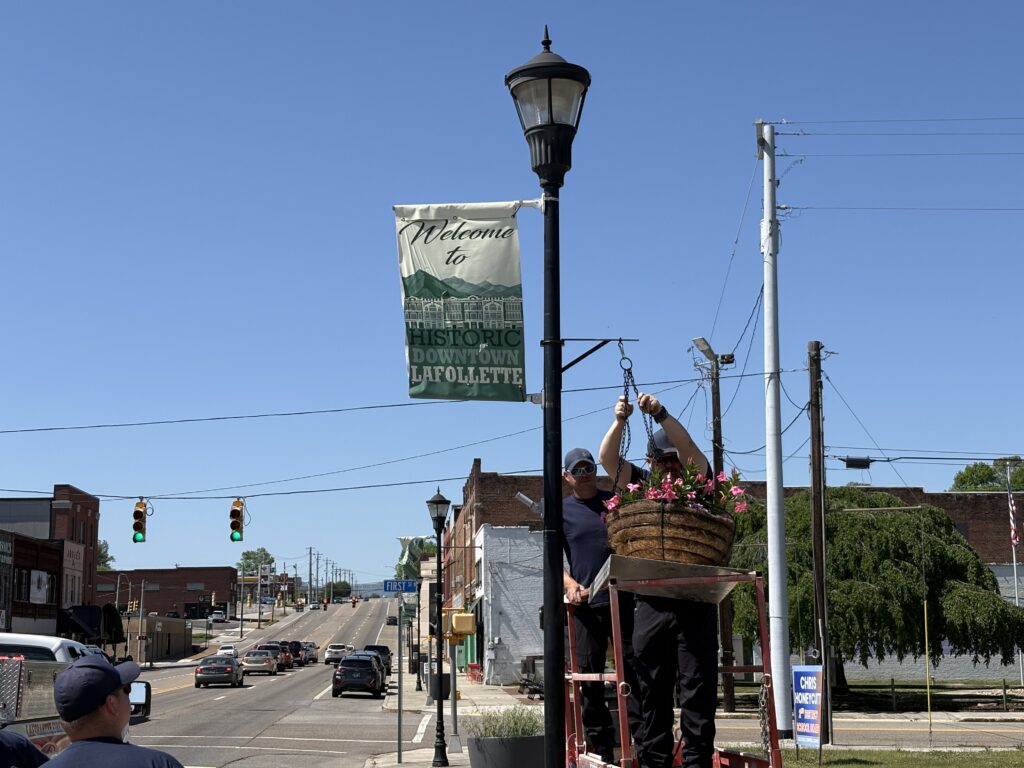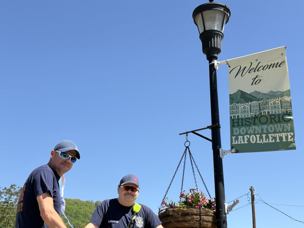 LAFOLLETTE, TN (WLAF)- La Follette Fire Chief Jimmy Pack along with members of the “C” Shift spent the balance of a beautiful Wednesday hanging flower baskets high above some of the streets in Downtown La Follette.